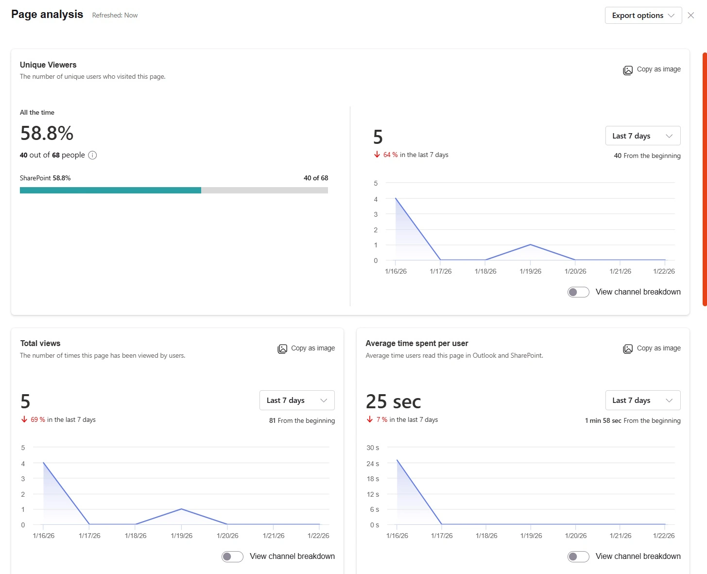 Page analytics allows you to check the performance of a specific SharePoint Page. You can see the number of unique and total views, the average time users spent, traffic by time, and the number of article promotions made.