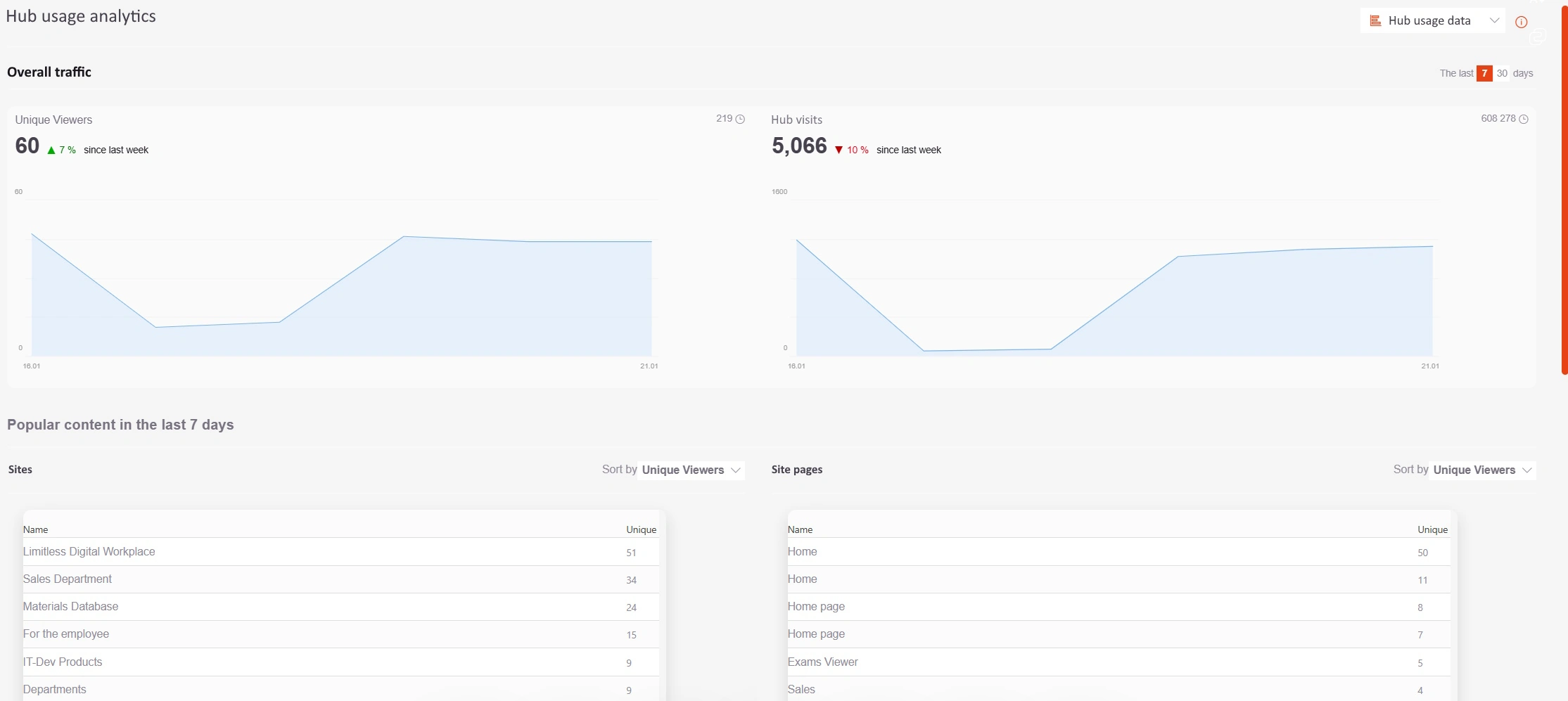SharePoint Hub Site Analytics lets you view usage statistics across the entire hub site. You can see how many visits your hub had, both unique and total. Hub site analytics dashboard displays the most popular content: sites, pages, news, and documents. Once again, you can narrow the reports by selecting 7- or 30-day time periods.