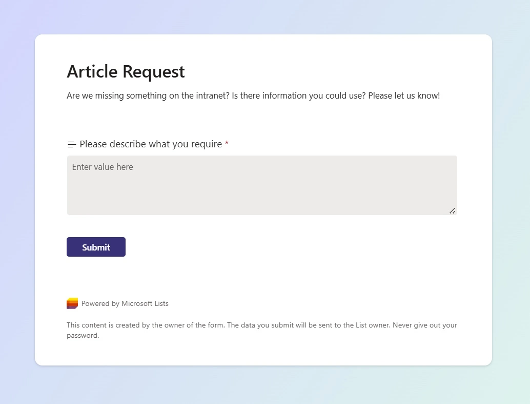 Using SharePoint’s native capabilities, it is pretty easy to create a straightforward feedback form. Users will send you information about their needs. You will be able to act on those. It is a win-win situation. You improve the quality of your portal while users feel heard, seeing their feedback turned into actual intranet resources.