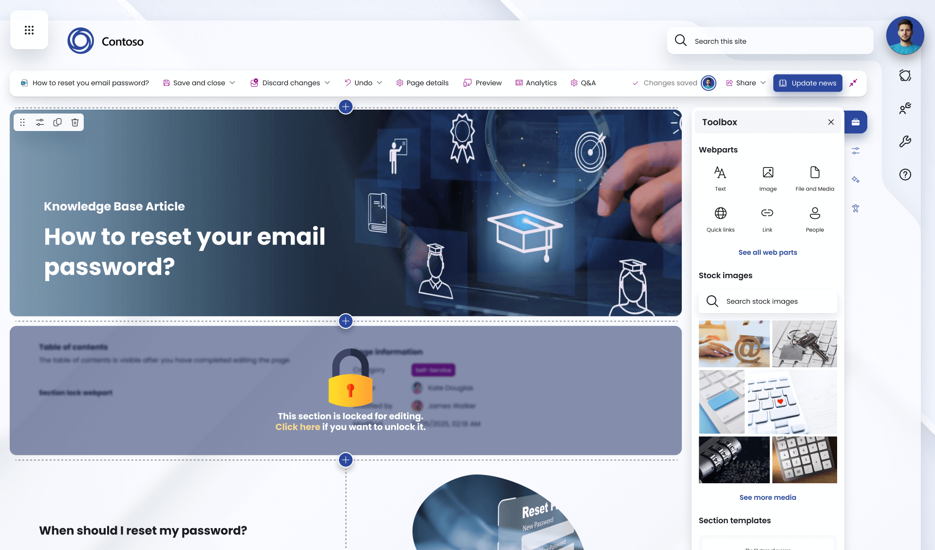 Turn default SharePoint pages into dynamic wikis that encourage collaboration and structured editing. Engagy360 Wiki Extensions overlay modern SharePoint pages with in-line section locking, enabling subject-matter experts to update specific content blocks without affecting the rest of the article. A built-in table of contents auto-generates based on headings, while real-time feedback widgets let readers rate usefulness or submit comments directly on the page.