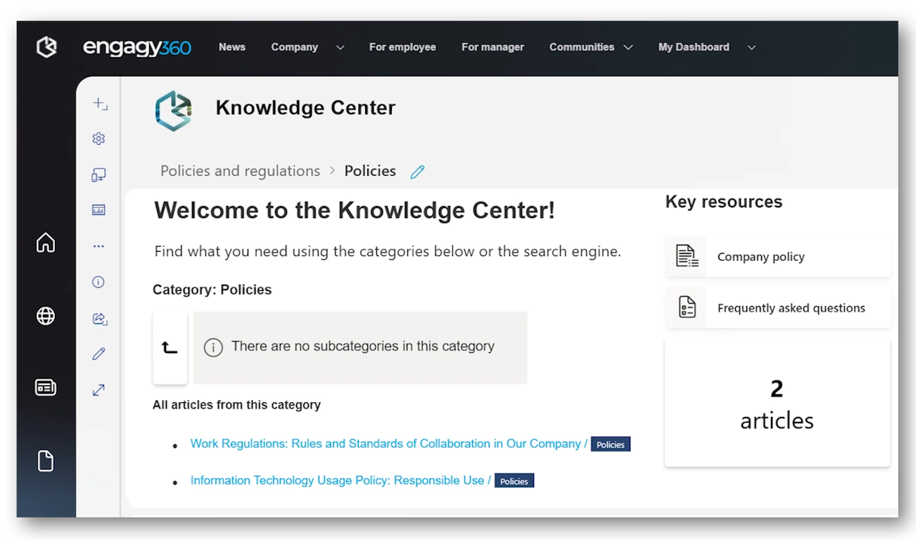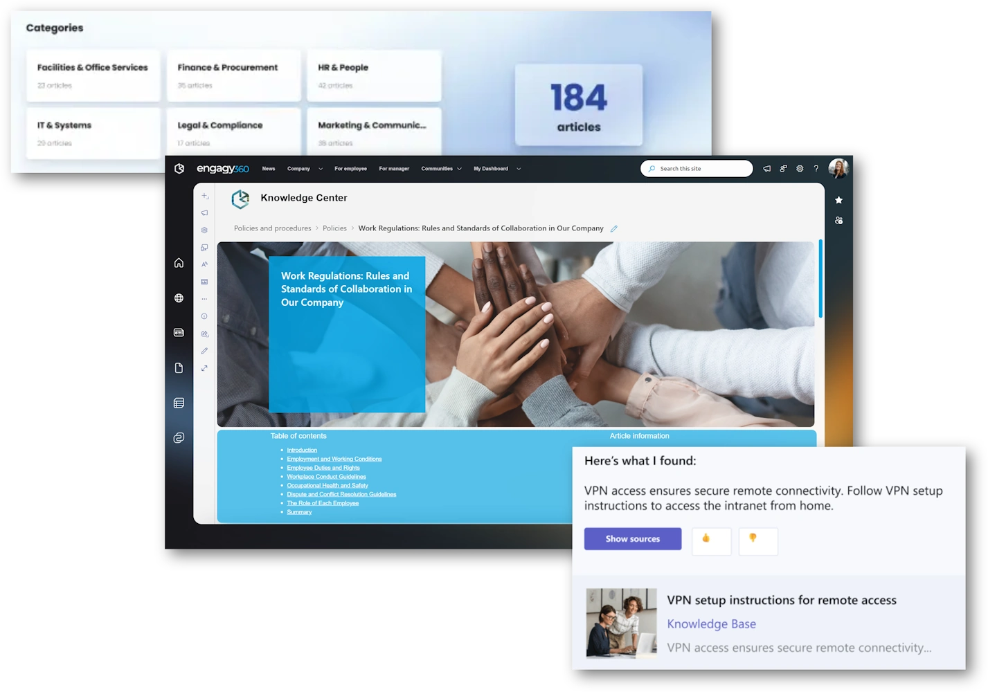 Engagy360 AI-Powered Knowledge Sharing transforms fragmented digital landscape into a unified, intelligent knowledge hub that connects people, content, and expertise across your organization. By leveraging ready-made templates, deep integration with Microsoft 365, and advanced built-in AI capabilities, the platform not only centralizes content but also enriches articles with dynamic metrics, personalized recommendations, and contextual insights.