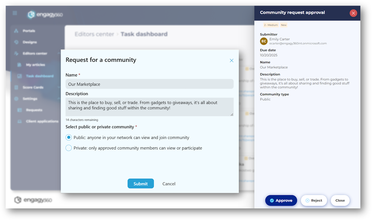 Engagy360 Self-Service Community Creation feature lets employees establish interest or project-based communities in Viva Engage, even when creation is restricted. Users can request new communities and an approval workflow ensures those communities are created according to the intranet’s governance framework.