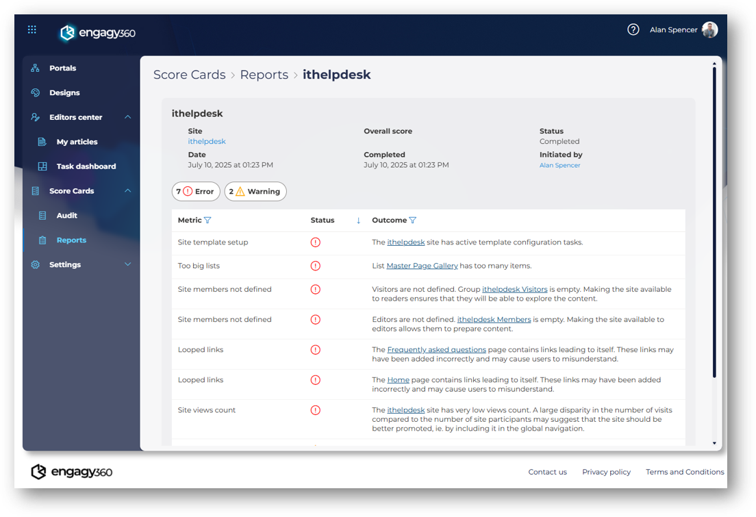 Site owners can generate detailed scorecard reports at any time, providing a clear overview of each site’s condition along with actionable recommendations for improvement. The system highlights exactly what needs attention, enabling editors and local administrators to make targeted fixes without requiring deep SharePoint expertise.